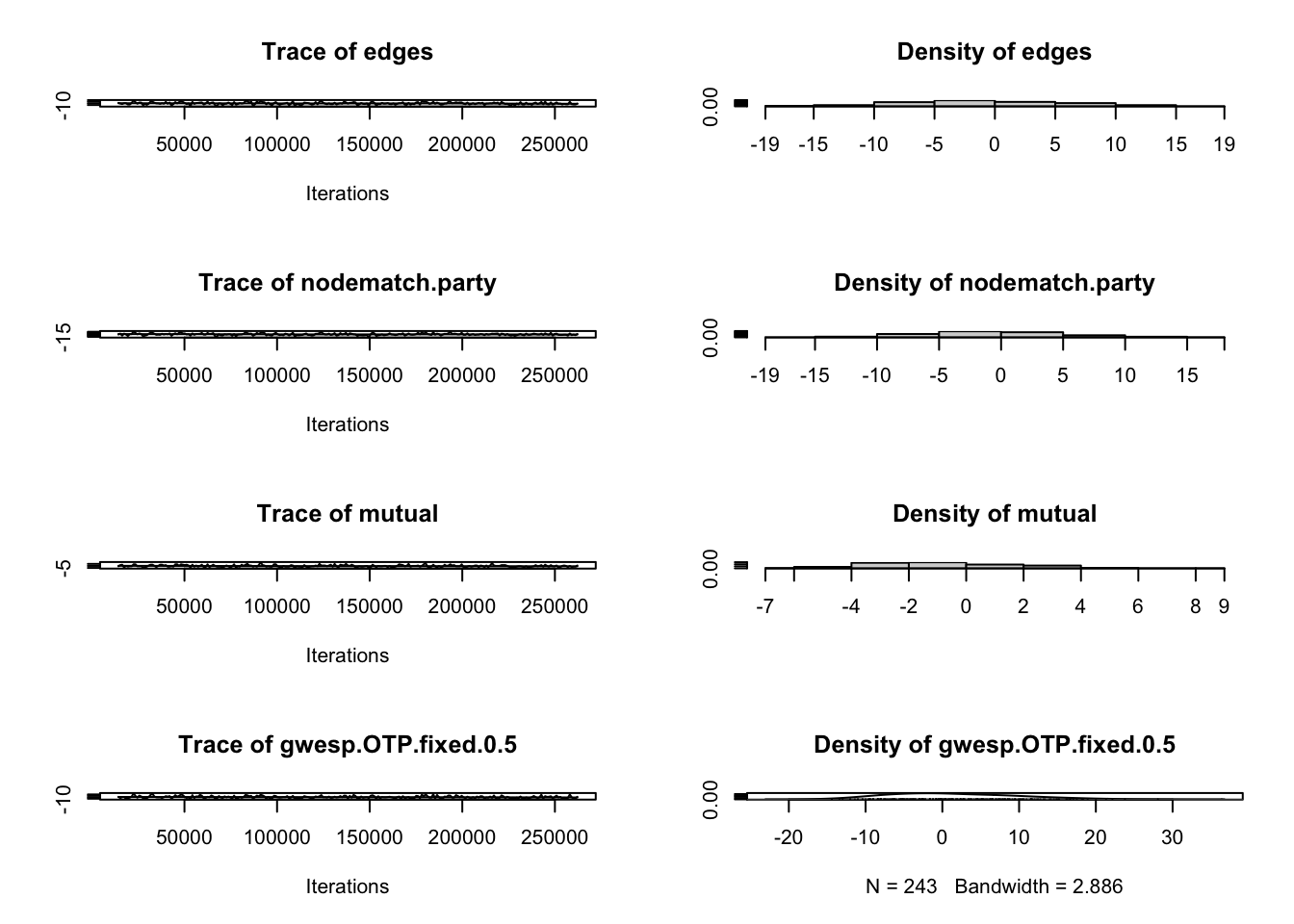 Finally, the summary includes – in the Geweke diagnostic – a measure of whether the MCMC chain has reached its stationary distribution and is therefore sampling from the target distribution (the ERGM model space). It helps determine if the specified burn-in period was sufficient. This works by dividing the chain into different segments and then asking if the mean parameters of each section are statistically significantly different from each other. The first set of numbers (for example, edges: 0.9022633) is the mean parameter’s Z-score. The second set of numbers (for example, edges: 0.3669170) is the corresponding p-value. Ideally, the segments are not significantly different from each other.