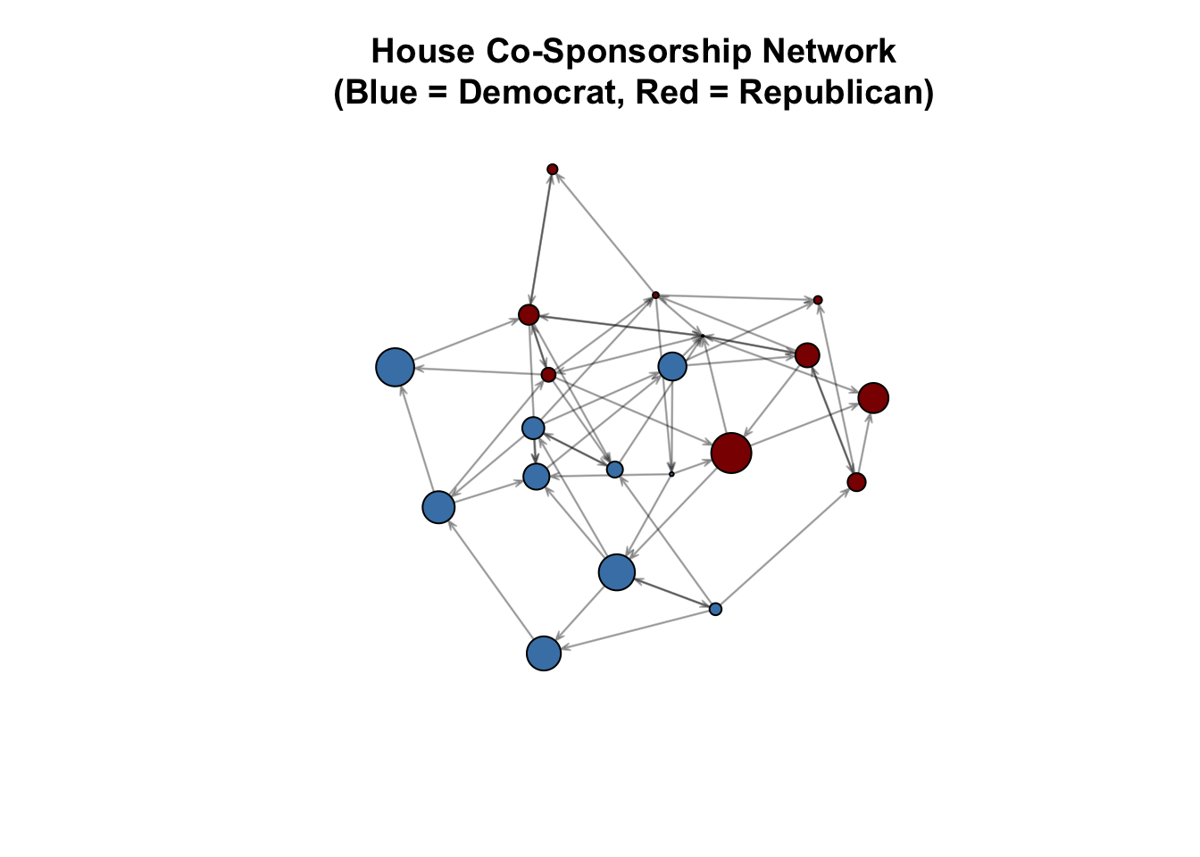 main = "House Co-Sponsorship Network\n(Blue = Democrat, Red = Republican)",