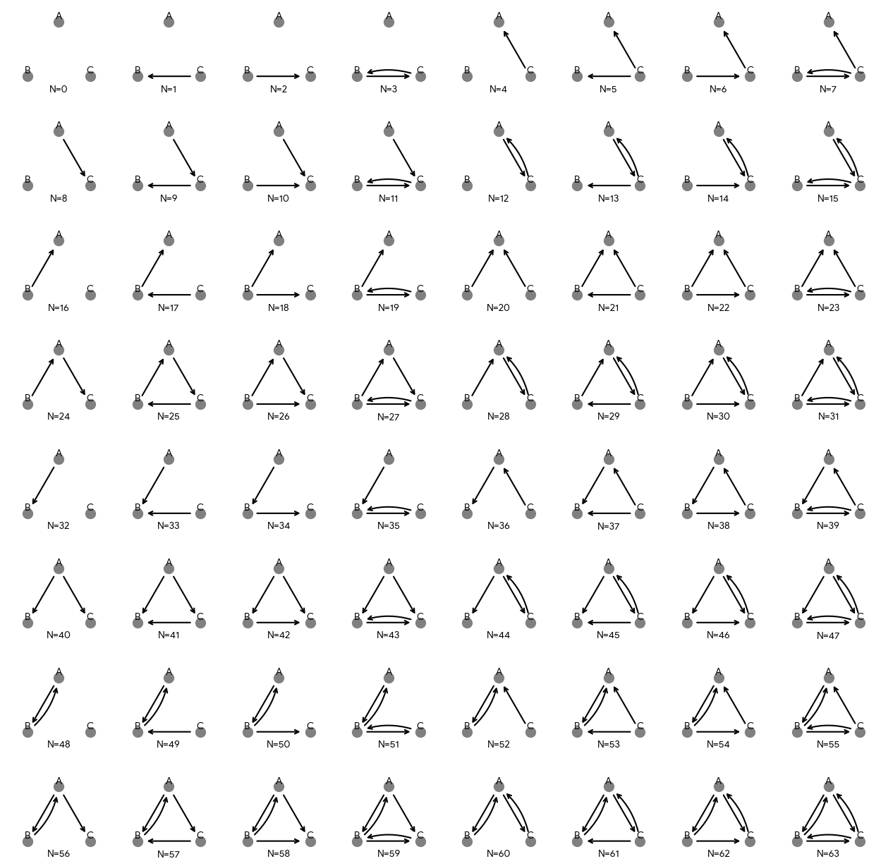 The number of possible networks grows exponentially with the number of nodes. With three nodes, we have a manageable 64 possible networks that we can enumerate completely. This lets us understand the mechanics of ERGMs before tackling larger networks that require simulation methods.